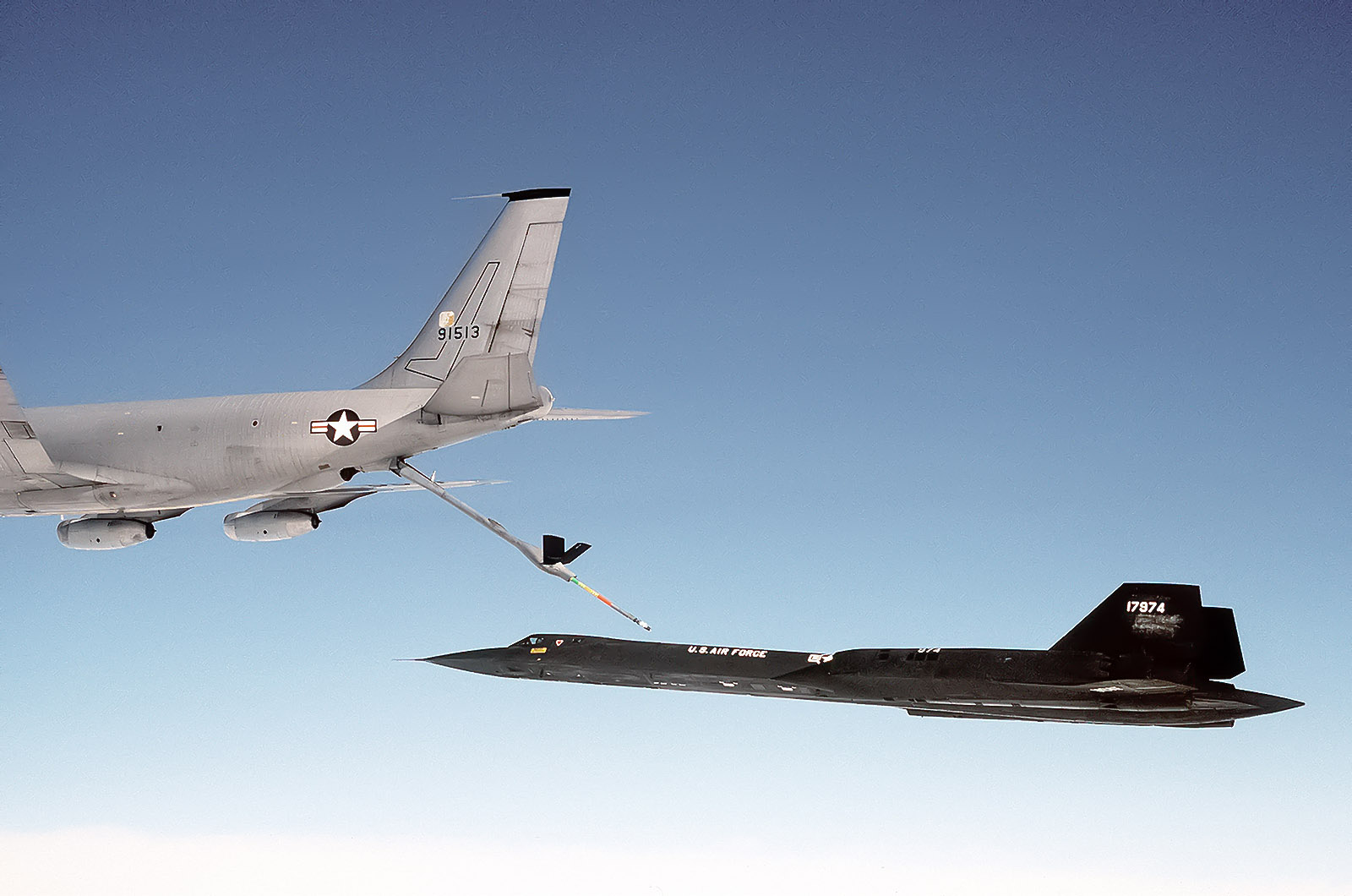 It served as the main strategic intelligence-gathering tool for the 'West' throughout the last 25 years of the Cold War. The SR-71 was capable of maintaining sustained Mach 3+ flight for more than an hour, collecting top-tier intelligence data through various sensors, and with mid-air refueling (as shown), the plane could have flown around the globe in a single journey.