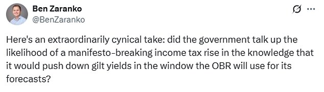 Ben Zaranko, an economist from the IFS think-tank, stated: 'Here's a highly cynical perspective: did the government suggest the possibility of an income tax increase that would break their manifesto in order to lower gilt yields during the period the OBR will consider for its predictions?'